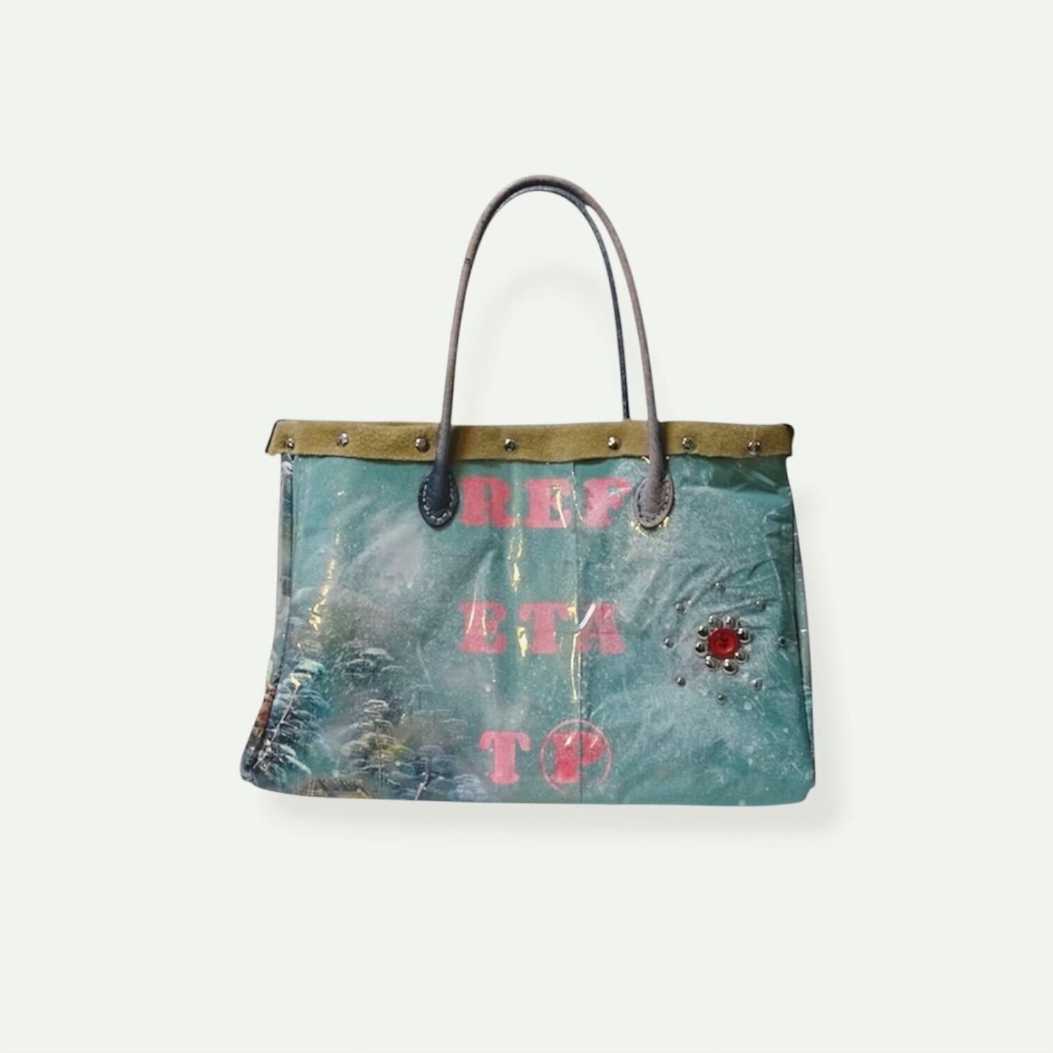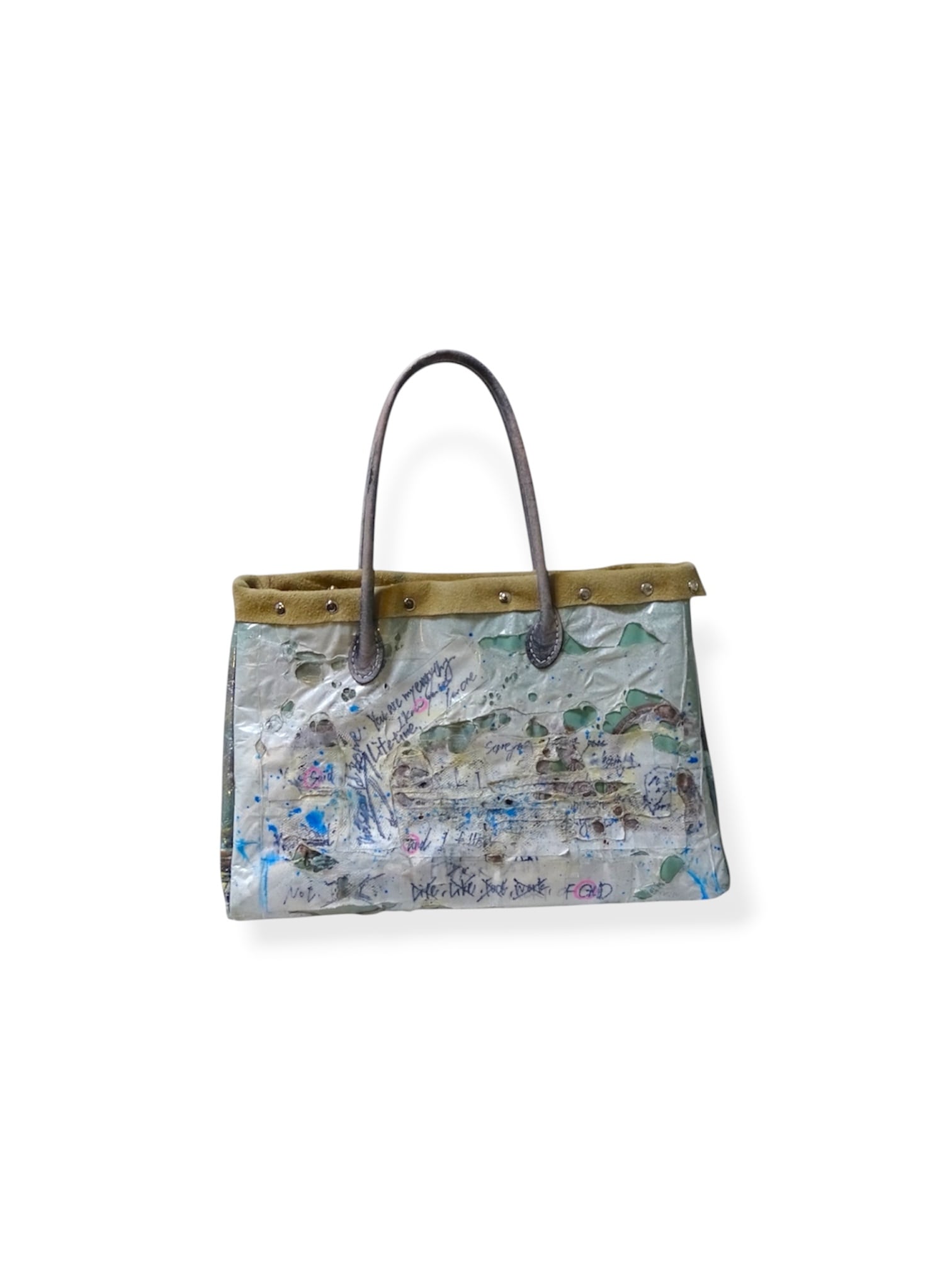 This experimental piece adds a unique character to the kimono fabric through heat treatment and prolonged exposure to sunlight. The nubuck leather and studs, used throughout the bag, blend seamlessly with the kimono fabric and PVC as the bag ages, further enhancing its vintage appeal.